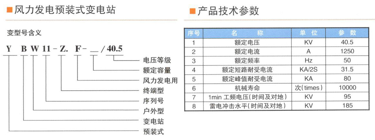 產品概述 風能是太陽輻射下空氣流動所形成的。風能與其它能源相比,具有明顯的優勢,它蘊藏量大,是水能的10倍,分布廣泛,用不枯竭,對交通不便、遠離主干電網的島嶼及邊遠地區尤為重要。目前,我國政府已經將節能減排和開發新能源提高到前所未有的戰略高度。當前風力發電已成為新能源的重要力量。為了配合國家風力發電的需要,我公司開發出兩個系列風力發電用變壓器。 YBW11-Z.F- /40.5系列風力發電預裝式變電站 該系列產品是集高壓熔斷器組合電器、變壓器和低壓斷路器為-體的成套變配電裝置。具有運行可靠、造型美觀和安裝使用方便等優點。 正常使用環境條件及用途 海拔高度:2000m 環境溫度范圍:- 45C- +45C戶外風速≤35m/ s 相對濕度:日平均值≤95%,月平均值:≤90% 安裝地點:安裝在無火災,爆炸危險,嚴重污穢,化學腐蝕及劇烈震動的場所 超出以上正常使用環境條件,用戶可與本公司協商解決適用于50Hz,35kY級風力發電系統,變壓器的額定容量為900 ~ 3150kVA,專用于風力發電 產品結構特點 變電站分變壓器室、高壓室和低壓室三部分,可分為“目”字形和“品”字形結構。變壓器性能符合新型S11型標準要求。 變電站外殼材料按照環境要求殼設計為:常規復合板、不銹鋼復合板和非金屬玻纖水泥材料等。外殼材料具有良好的防護等級與防腐能力,可有效防止風沙風雪和鹽霧侵蝕。 高壓電器滿足五防功能;變電站高壓熔斷器與高壓負荷開關聯動保護,杜絕變壓器缺相運行;高壓采用三工位負荷開關,開關滿足在接地狀態時確保安全檢修;高壓負荷開關與變壓器室網門電氣閉鎖,實現誤開網門自動斷電保護功能。 變壓器室采用自然通風和自動控制的強迫散熱排風裝置,具有隨溫度變化而自動控制的排風系統,能有效控制降低箱內溫度滿足全負荷運行要求。 低壓側配置690V主斷路器、過電壓保護器,并可成套設計自動化測量與智能控制系統。
